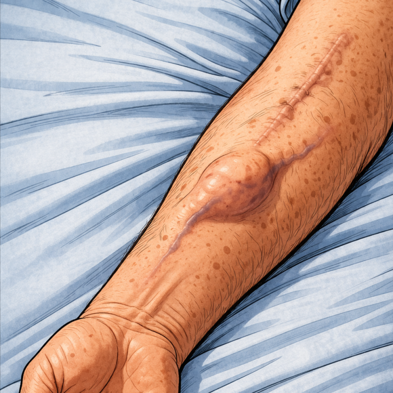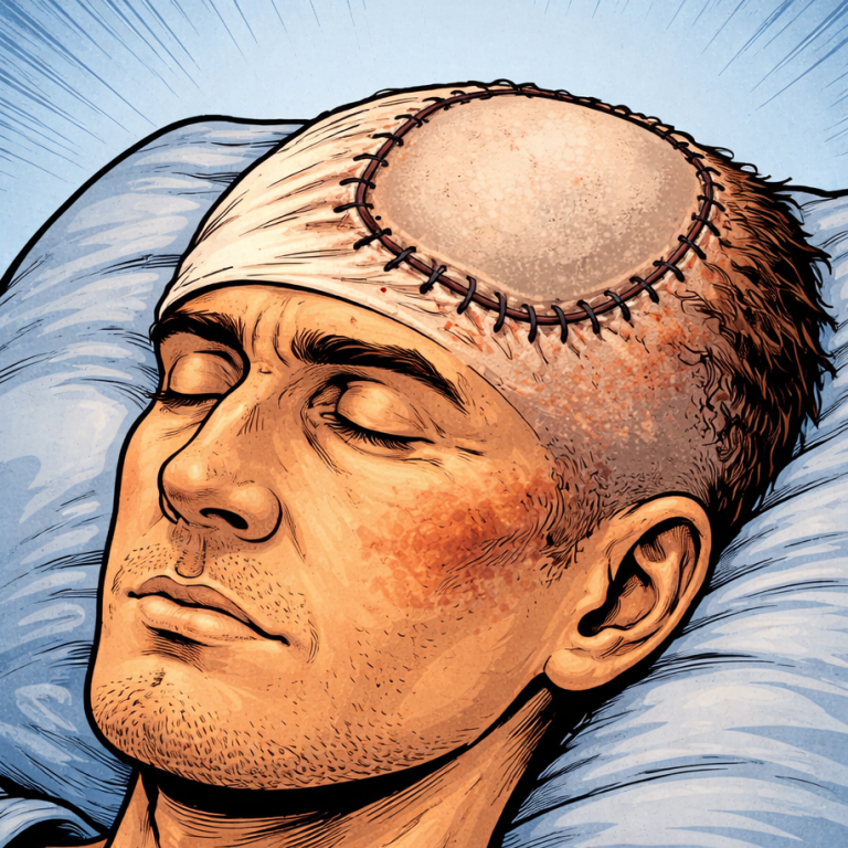 Hemikraniektomie (eine einseitige Entfernung des Schädelknochens zur Entlastung einer Hirndrucksituation (Unter der Haut befindet sich demzufolge das weiche Hirngewebe)