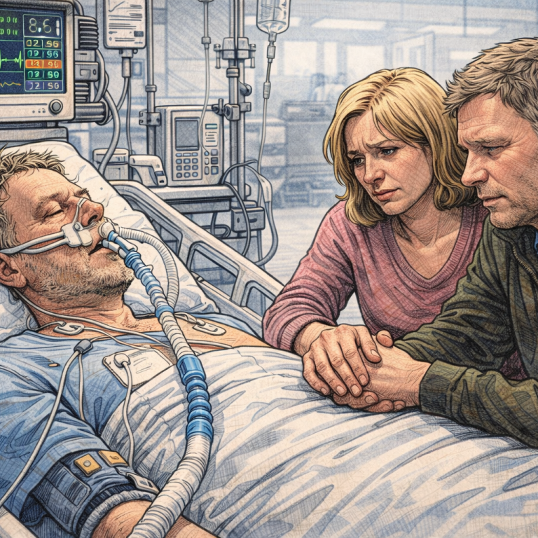 Angehörige am Krankenbett zur Verabschiedung, nach festgestelltem Hirntod (isolierte Situation in Deutschland zur möglichen Organspende nach dem Tod, Einwilligung vorausgesetzt)