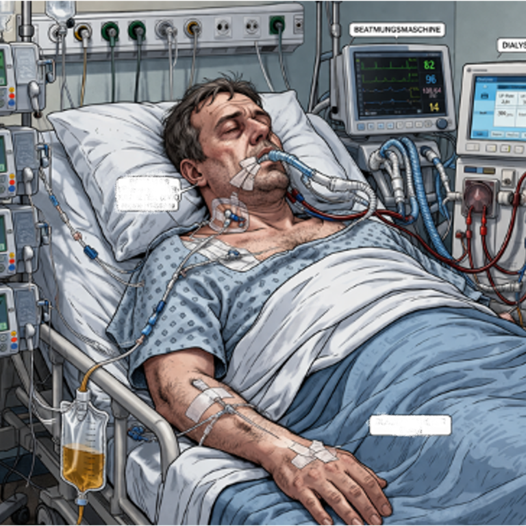 schwerkranker Patient auf einer Intensivtherapiestation (ITS), im künstlichen Koma liegend, beatmet und mittels Dialyse (Blutwäsche bei Nierenversagen) versorgt.
